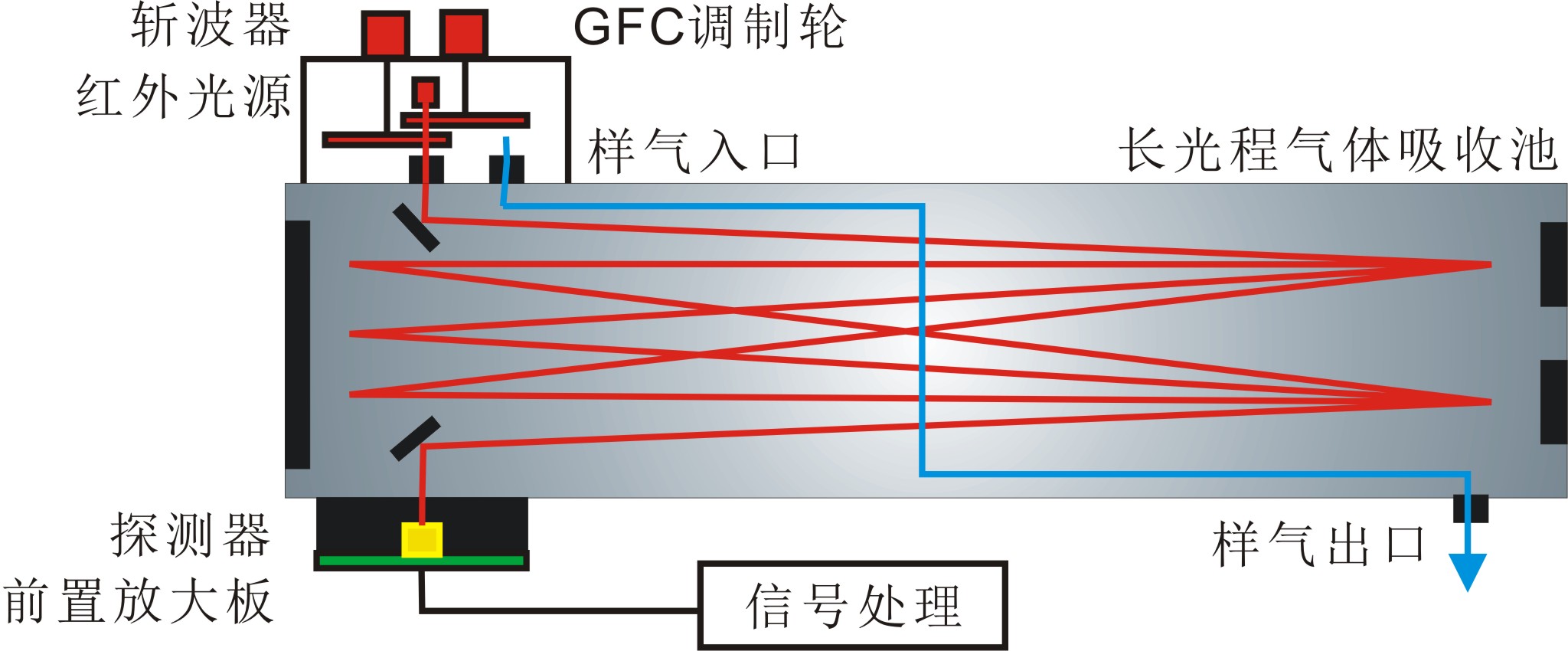 光源發(fā)出的紅外光經(jīng)GFC調(diào)制輪交替進入氣體池,一路被充滿待測氣體的氣泡所吸收,一路穿過完全不含待測氣體的氣泡兩路光分別經(jīng)透鏡匯聚后由紅外探測器接收,經(jīng)過信號處理得到測量信號和參考信號。通過對兩路信號進行分析,可以得出氣體中相關(guān)組分的濃度。